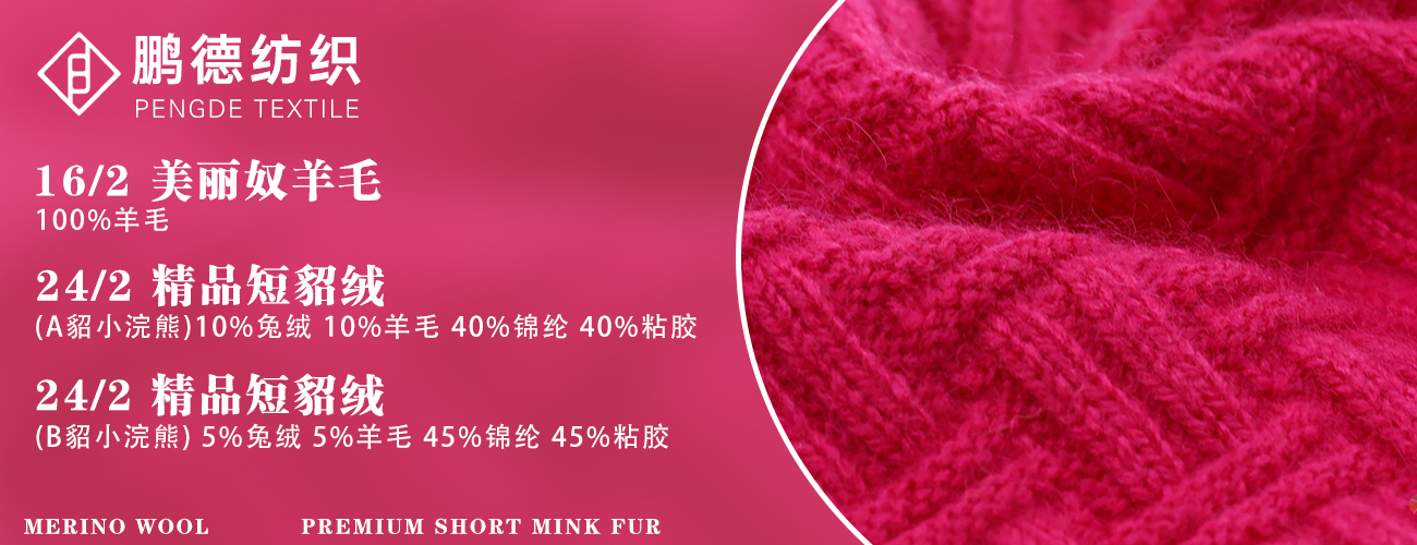 东莞市鹏德纺织有限公司(简称鹏德纺织)公司坐落于中国的羊毛衫名镇大朗。自2007年以来一直把提高纱线品质与开发新型的纱线为我们的目标,不断为更多的毛衫企业及品牌服装企业提供更优质新型的纱线,成为您最好的纱线供应商是我们始终不变的追求。